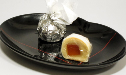 北海道十勝産手亡餡をホワイトクリームチョコで包みました。中に津軽産紅玉りんごジャムが入っております。